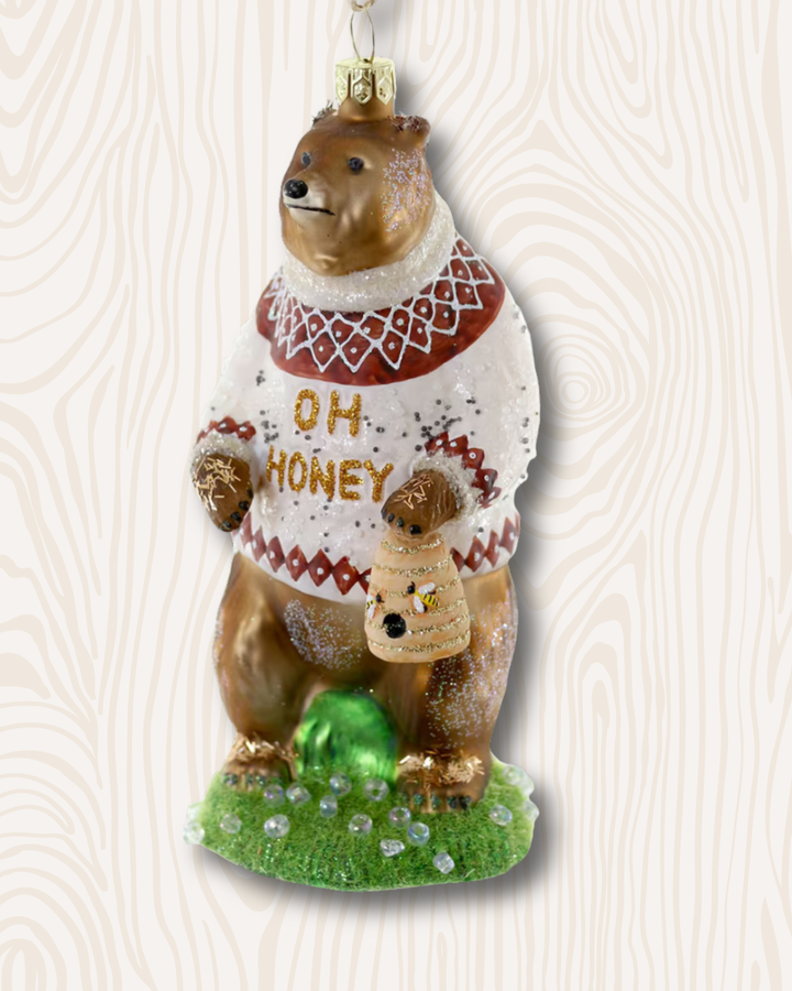 Bring a touch of woodland charm to your holiday tree with our Oh Honey Bear Ornament. Dressed in a cozy knit sweater that reads “Oh Honey” and carrying his favorite treat, this sweet bear is ready to settle into cabin life. With warm details and playful character, he’s the perfect mix of rustic and whimsical.