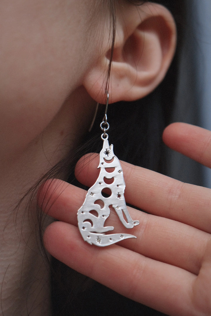 Embrace your inner goddess and untamed spirit with these celestial wolf earrings. Crafted from stainless steel, each pair features a striking howling wolf accented with moon and star cutouts for a mystical, moonlit allure. Lightweight, durable, and designed to inspire your wild side, these earrings are perfect for dreamers, wanderers, and lovers of the night sky.