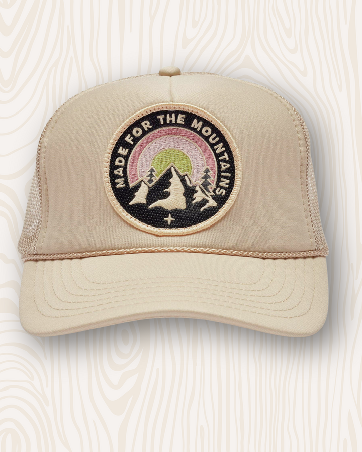 Show your love for the peaks with this timeless trucker hat. Designed in a versatile tan shade, it features a round embroidered patch of a mountain range framed by evergreens and a soft sunrise, paired with the words “Made for the Mountains.”