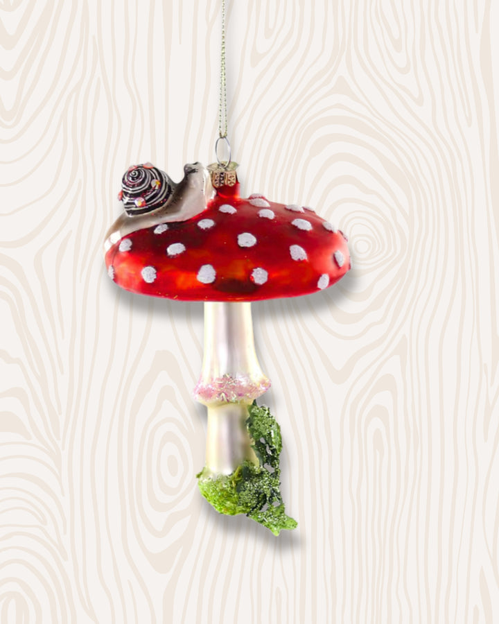 Glass Mushroom and Snail Ornament, 4.25 inches tall. This whimsical design features a red-capped mushroom with white spots, complete with a tiny snail perched on top. A charming woodland touch to bring a bit of forest magic to your holiday tree.