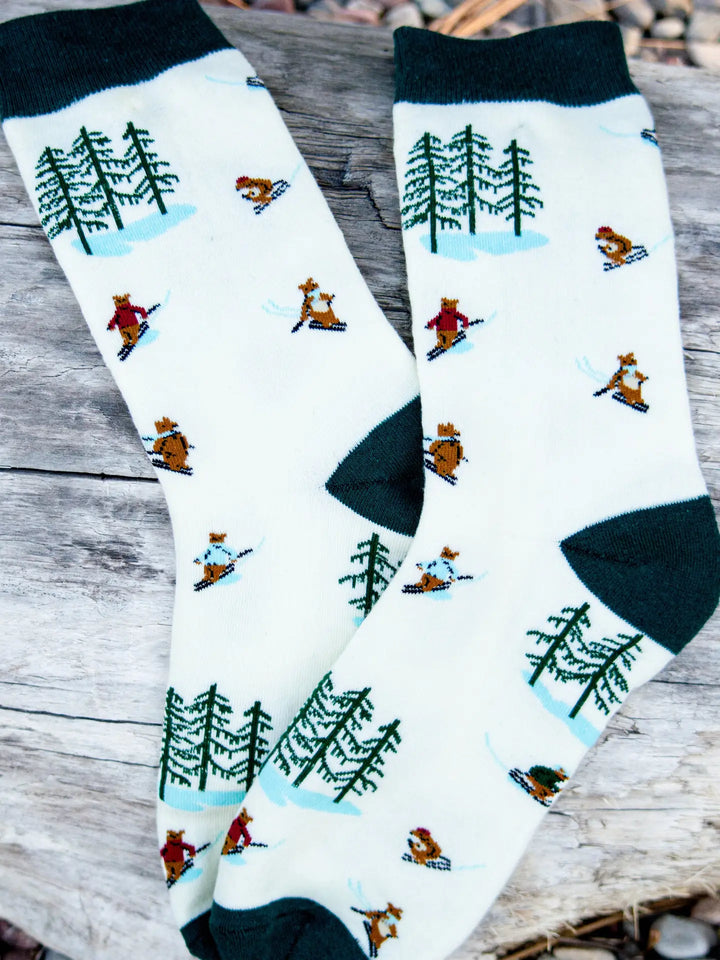 Hit the slopes in cozy style with our Skiing Bear Socks! These cream socks feature adventurous bears carving down snowy hills surrounded by pine trees — a whimsical winter design that’s equal parts fun and comfy. Perfect for mountain days, cabin weekends, or gifting to your favorite ski bum. Sock size US8-13
