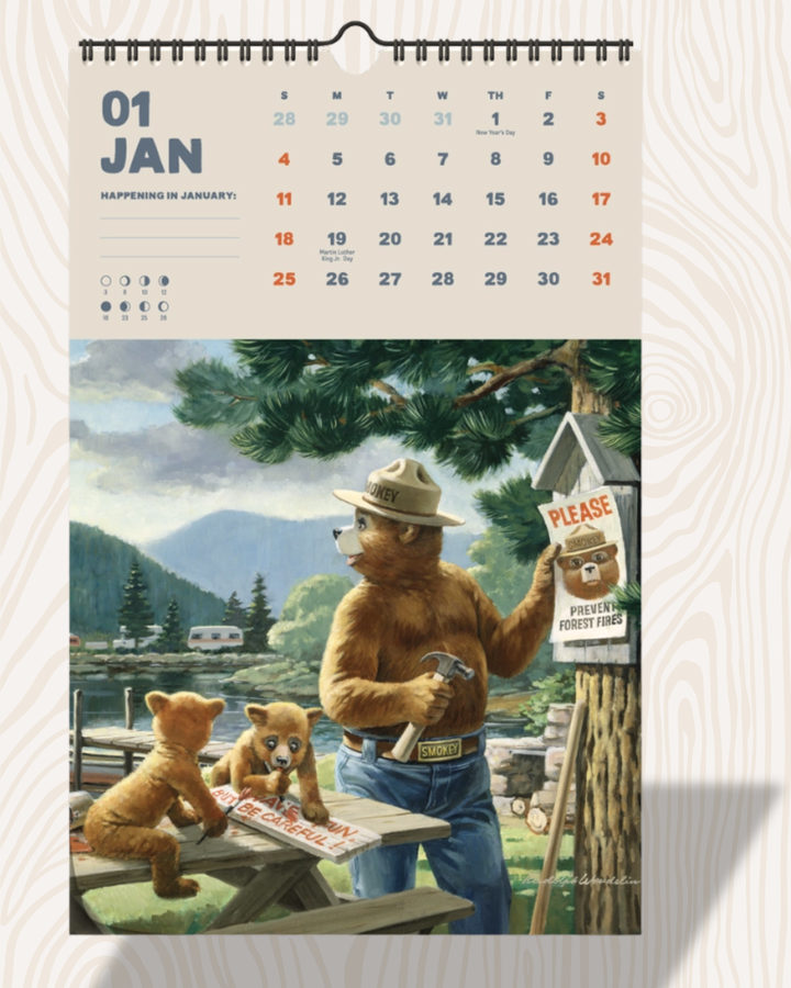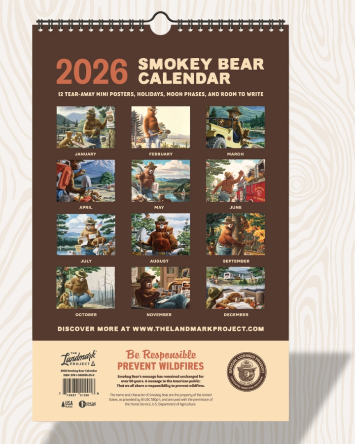 This calendar isn’t just a tribute to Smokey Bear. It’s a year-round reminder of how one character, one message, and one mission have shaped the way we care for our public lands. Smokey’s legacy started in 1944, and the artwork inside reflects eight decades of wildfire prevention messaging that still matters today. These illustrations, originally created by Rudy Wendelin, are more than nostalgia. They’re part of a cultural story that continues to inspire generations to protect what they love. New for 2026, each page is perforated so you can tear out and reuse the artwork. Hang up your favorite scene, give one to a friend, or build a gallery wall that keeps Smokey’s message alive all year long.