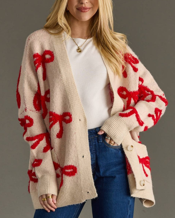 Wrap yourself in cozy holiday charm with this soft tan button-up cardigan featuring a playful red bow design across the front and back. Made from 100% acrylic, it’s perfectly lightweight yet warm - ideal for layering over your favorite tee or turtleneck. The relaxed fit and chunky ribbed cuffs give it that effortless, laid-back look that’s made for fireside gatherings, festive errands, or a cozy night in.