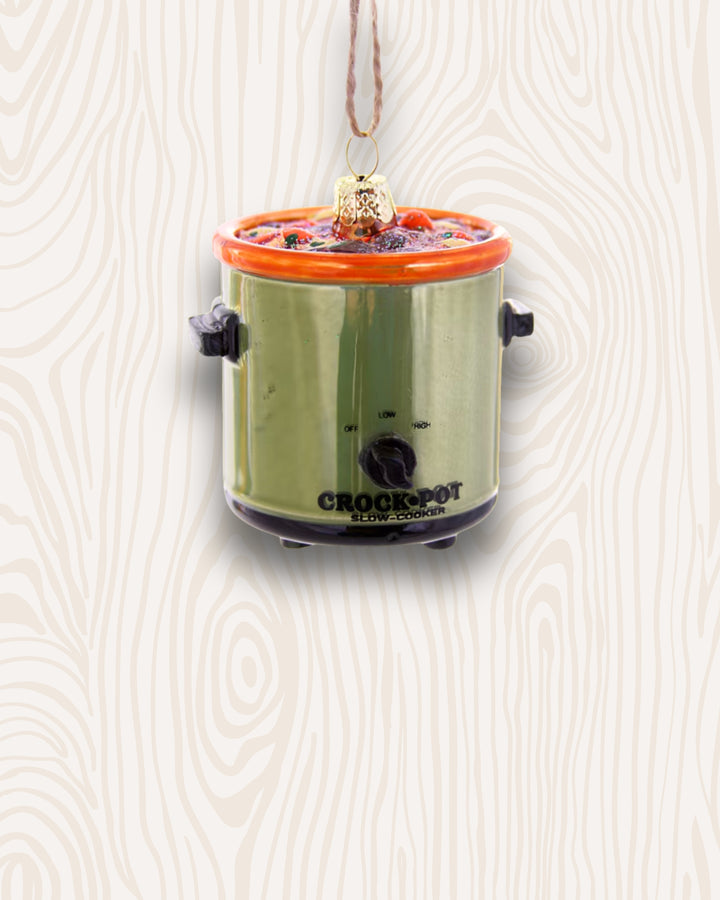 Bring a little retro kitchen magic to your holiday tree with this Vintage Crockpot Glass Ornament. Designed with hand-painted details and a glossy finish, it captures the charm of the classic slow cooker - complete with a bubbling pot of comfort food on top.