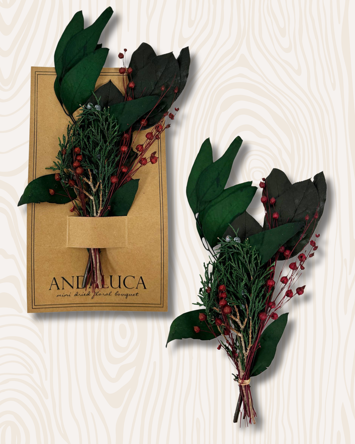 Our floral team designed this beautiful MINI bouquet using an assortment of willow eucalyptus, a juniper sprig, and flax to create this charming and petit mini bouquet arrangement. Each bouquet is designed and handcrafted in our California design studio and is a perfect decorative accent to your table scape or vignette. - 8" long - Comes in packs of 6. - Each bouquet is placed in a decorative paper card.